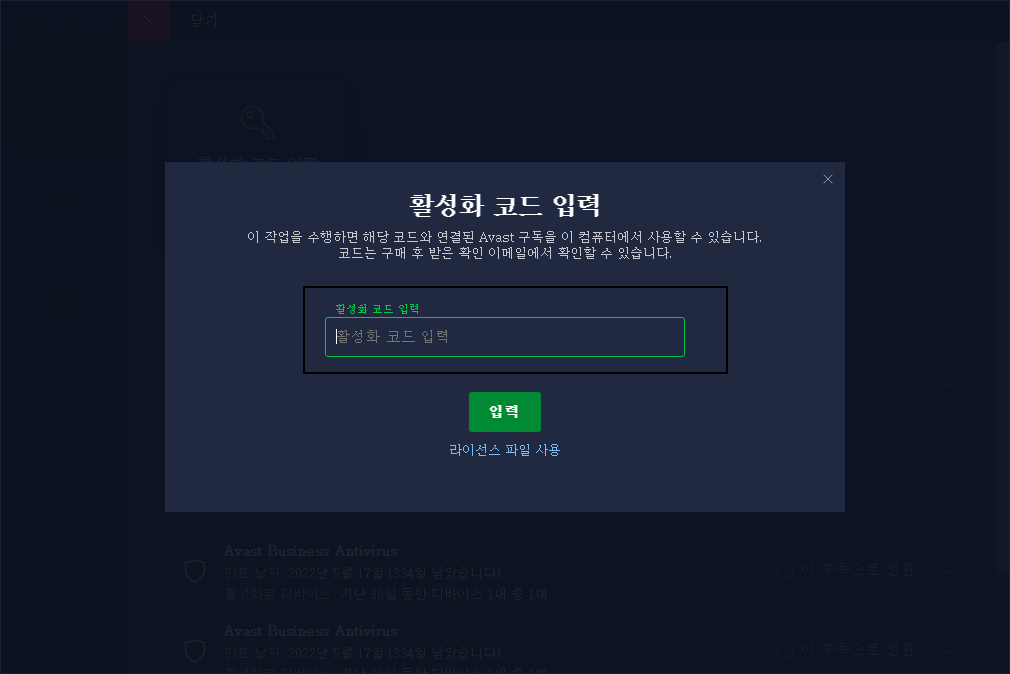 3. 이메일로 받으신 활성화코드를 개별적으로 등록합니다. 최초 등록시에는 활성화코드를 입력하지만 활성화 이후에는 변환된 라이선스키를 입력하거나 백업 받은 license.avastlic 라이선스 파일을 사용하여 파일 등록하여 등록할 수 있습니다.