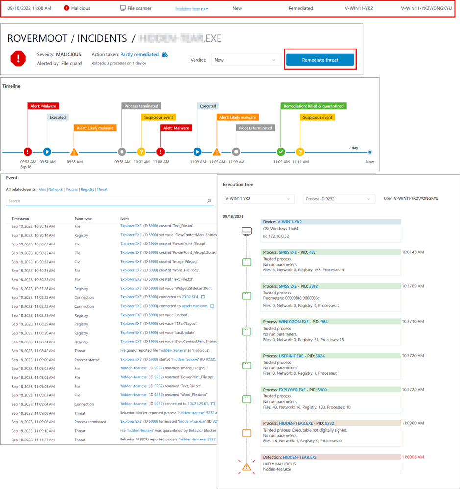 3. Emsisoft 중앙관리콘솔의 Incidents 패널에서 Malware에 의해 수행된 작업을 Execution tree, Timeline, Event 항목을 통해 정확하게 확인할 수 있으며, Remediate threat을 통해 롤백 동작을 수행할 수 있습니다.